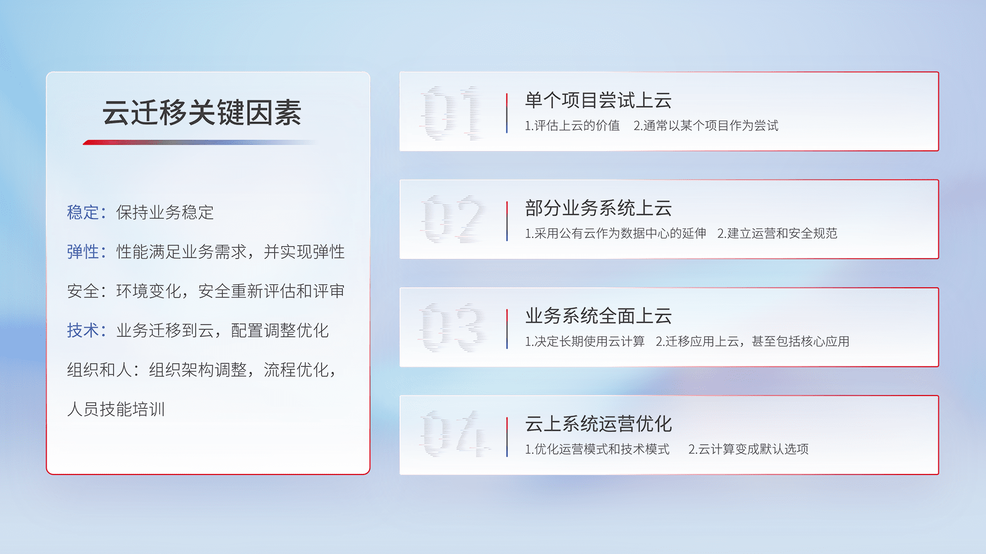 结合实际业务,,,从规划设计、、、、云平台选型、、、云原生改造、、数据迁移、、集成交付,,,,迁移全过程为客户识别最佳上云路径,,,,做好风险识别管理,,,设计网络架构、、、身份权限、、、安全审计合规、、、、操作审计、、、日志审计、、、监控告警策略、、多站点容灾设计等,,,对云上基础设施进行整体规划,,,,提升IT治理水平,,以满足弹性、、高可用、、高性能的需求。。。