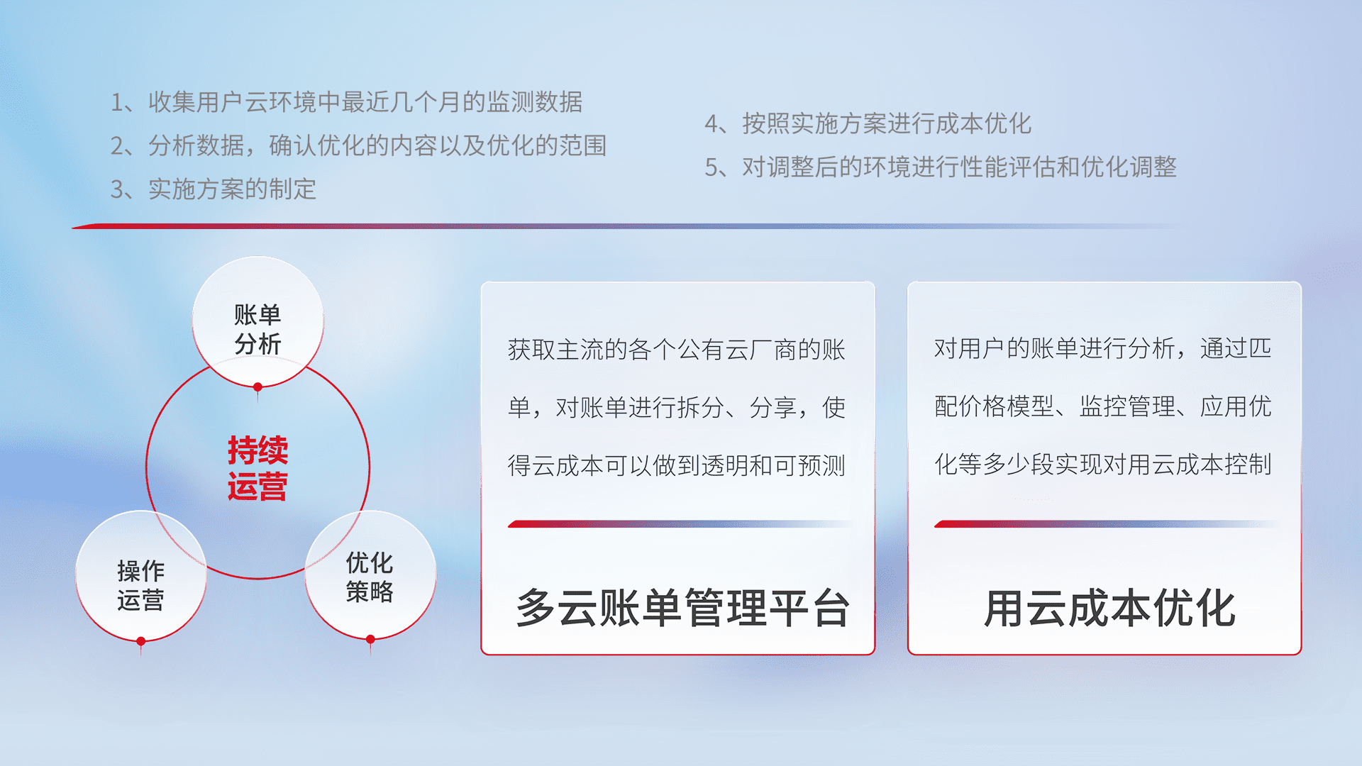 通过多云纳管,,,,以统一的资源数据模型把客户的云资源进行抽象和封装,,,进而实现对多云资源的统一操作,,,保障云资源管理的可靠性、、、稳定性与可用性。。。量身定制化运维内容,,,配置、、、、开发运维、、、、补丁管理、、备份、、、监控、、认证和访问管理、、、审计和日常巡检等,,,,保障在用云过程中的可靠度,,稳定度以及高可用率。。。